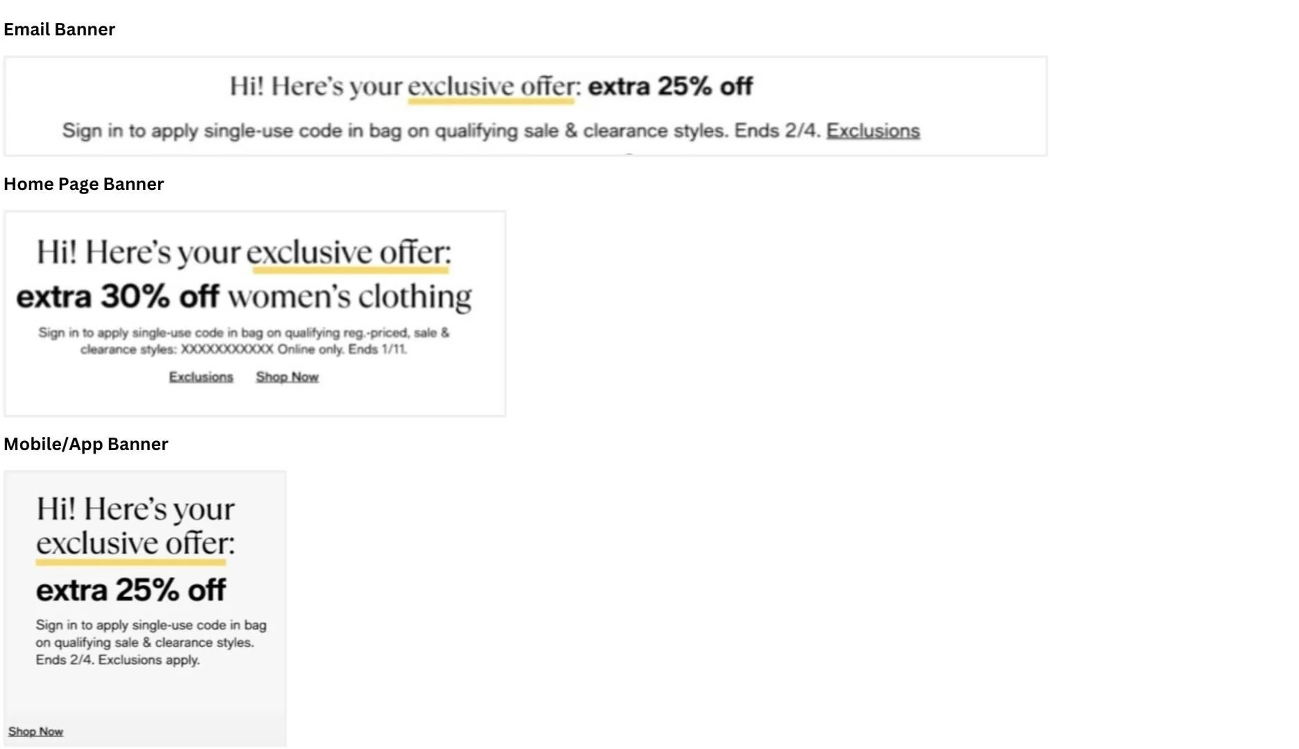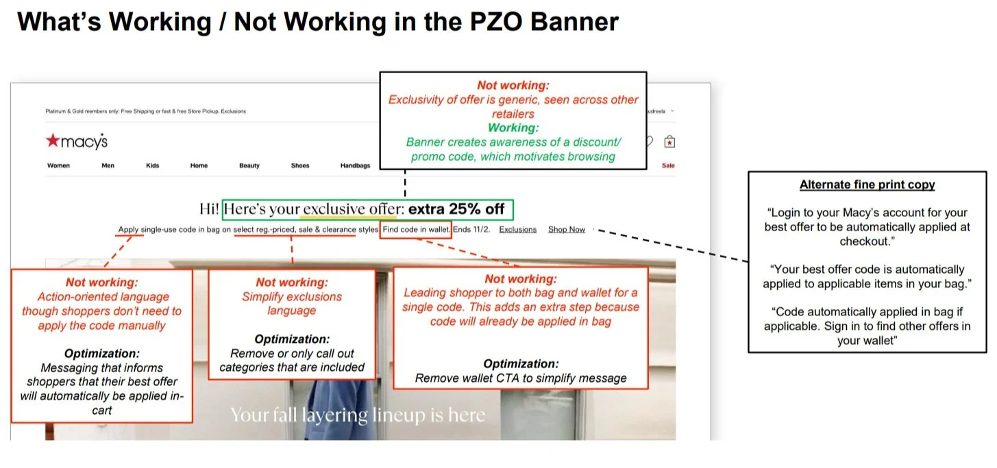 For our Macy’s Personalized Offers program (PZO), I partnered with UX, CX and Creative teams to develop a new, cohesive PZO banner design